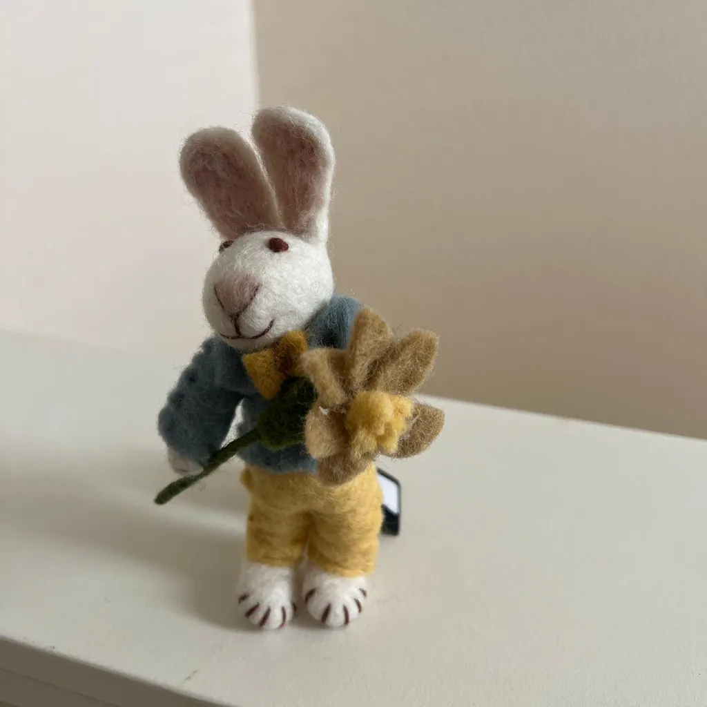 Add a handmade touch to your Easter celebration with this adorable felt bunny ornament. Ethically crafted from sustainable wool this charming rabbit holds a tiny carrot. Perfect for decorating or gifting.